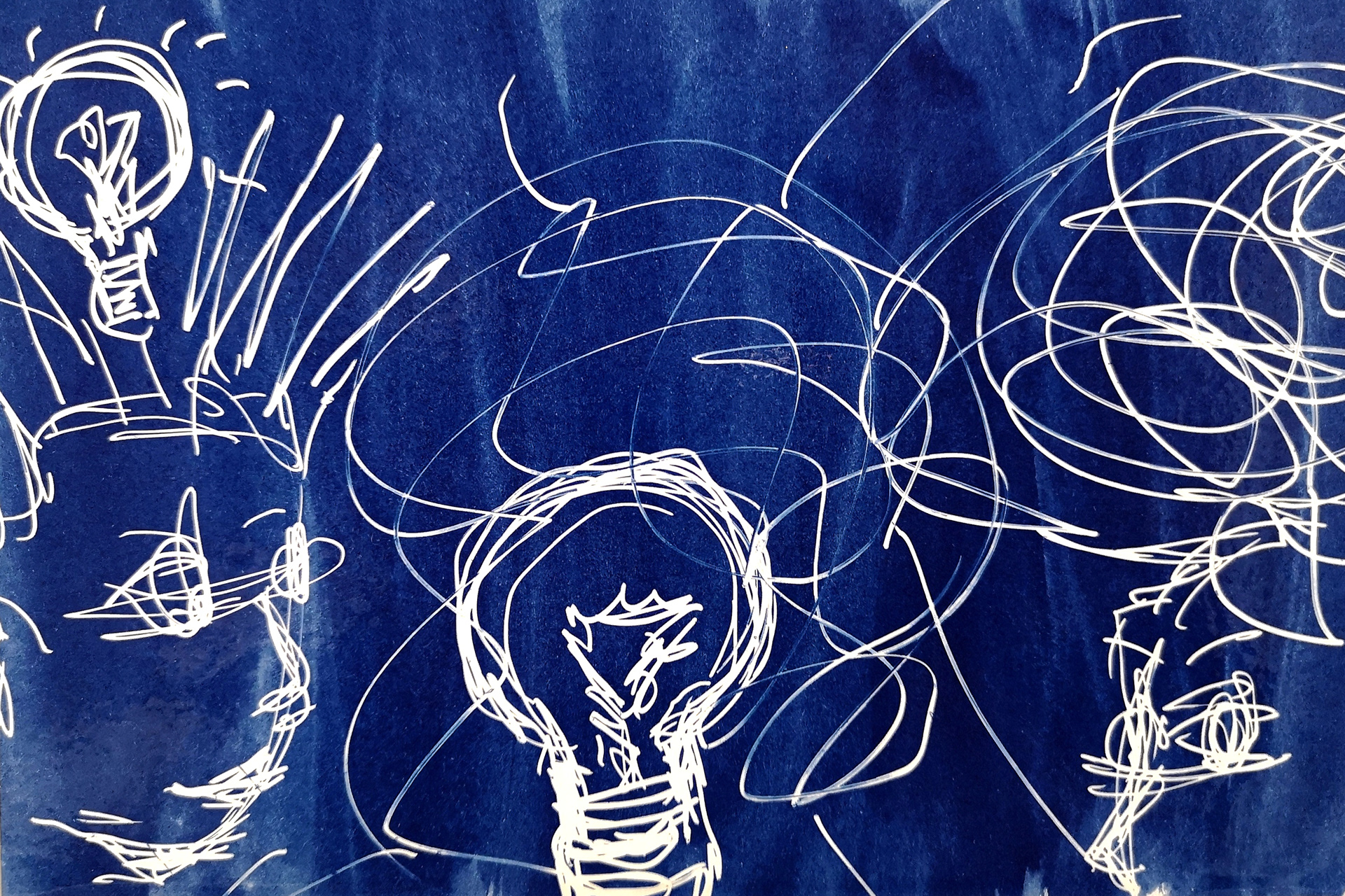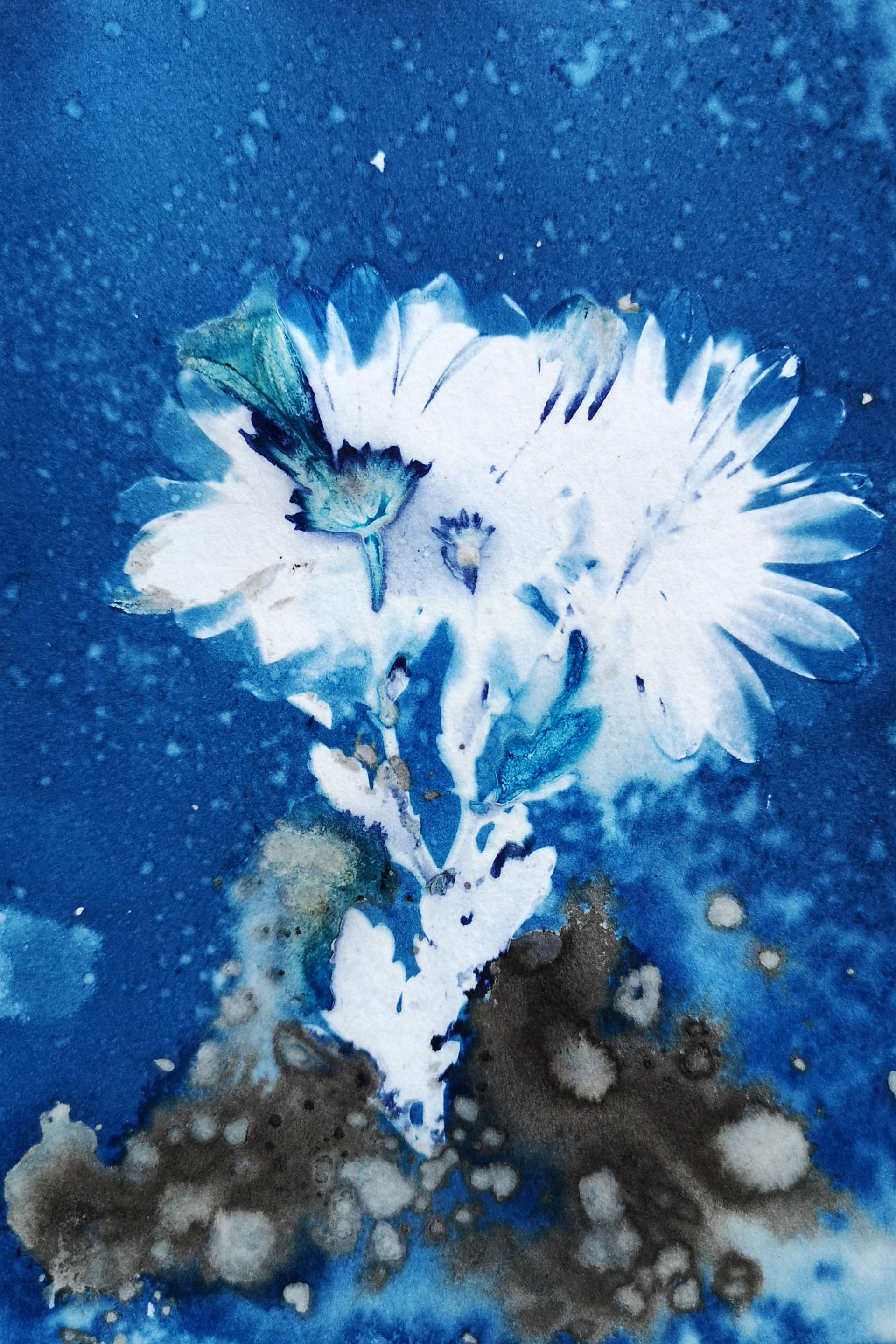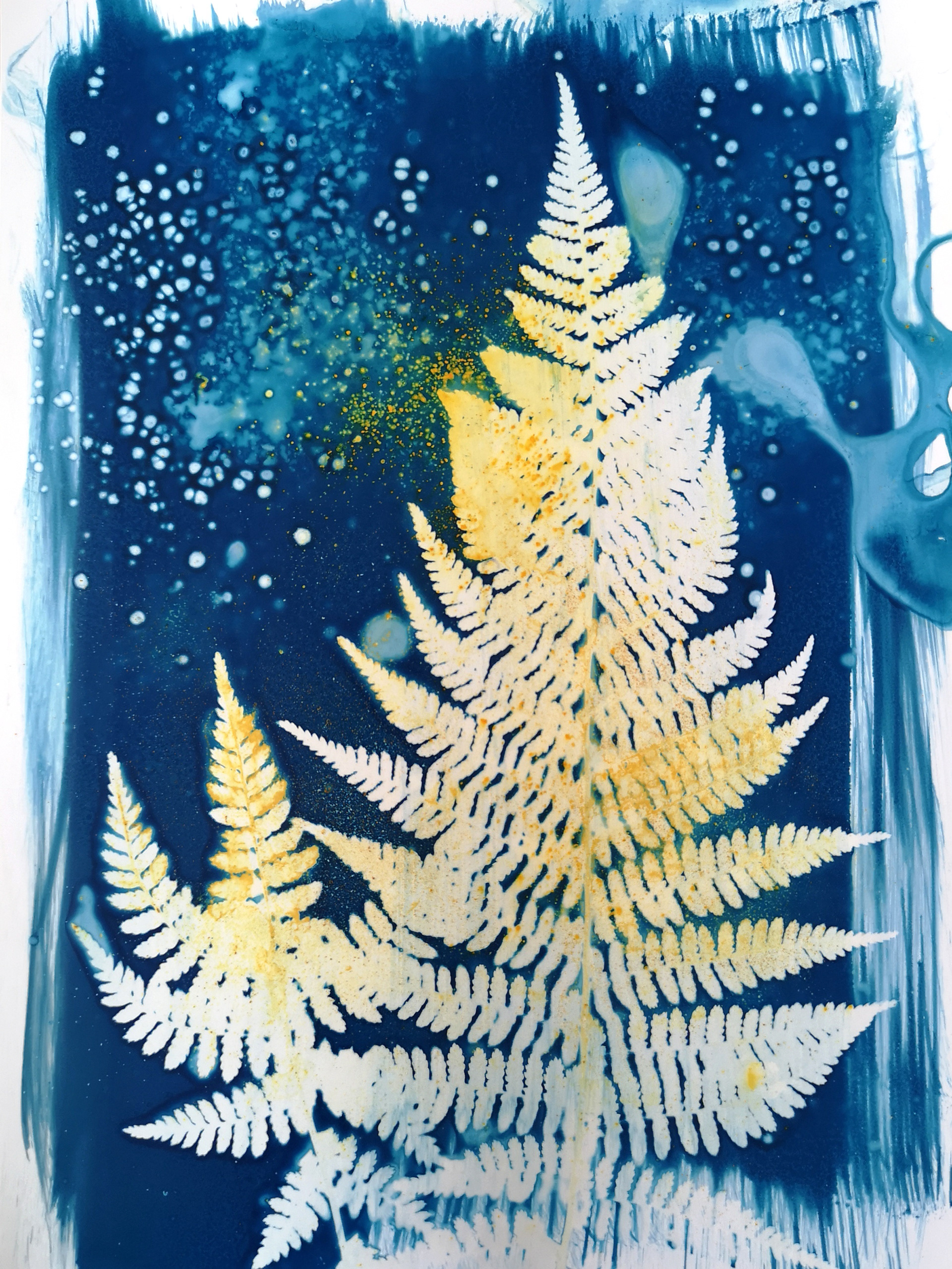Se aplica sobre un papel una emulsión, colocas un objeto encima, la emulsión reacciona a la luz del sol, después de su revelado se obtienen unas imágenes en diversos tonos de azules.